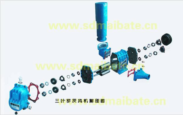 与两叶型相比之下,三叶罗茨风机的工作原理是气体脉动小,振动也小,噪声低。椭圆形壳体,叶轮的端面以及风扇的前后盖以及风扇叶轮之间自始至终维持很小的间隙。在同步齿轮的驱动下,风从风扇入口沿外壳的内壁流向出风侧。两个转子固定在一组同步齿轮上,因此在转动时,两个转子之间维持很小的间隙。气缸和转子不互为触及。一般情形下,间隙约为十分之几毫米,由于彼此之间并未摩擦,因此可以高速运行以取得较大的风量或排气速度,风扇的内腔不需要润滑油,具构造简便,运行安定,性能平稳,适于各种目的,已被普遍应用于各个领域。